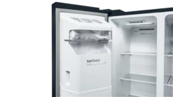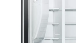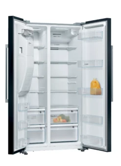 This black freestanding American fridge freezer from Bosch is a perfect addition to your kitchen. With a spacious 533 litre capacity, it can hold 29 bags of delicious food and treats. You’ll also enjoy never having to manually defrost it again thanks to its Frost Free technology. A fan circulates cool air to prevent ice build-ups from forming on the walls. And the Water and Ice Dispenser gives you fresh water and cubed ice on tap; it just needs a plumbing connection, which means you don’t have to keep manually filling a tank. Plus, the FreshSense systems monitors and controls the temperature inside the fridge and freezer compartments, so that ingredients keep their freshness and flavour.