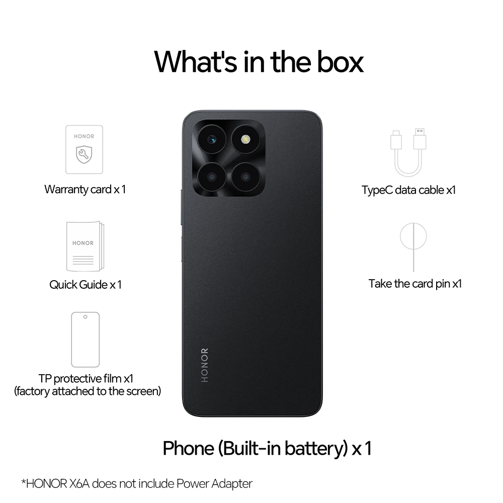 The 6.56-inch 90Hz HONOR FullView Display provides an intimate and comfortable visual experience all day long. HONOR X6a delivers an immersive visual experience, no matter when the user is working, streaming videos, or gaming. HONOR X6a features an impressive ultra-clear Triple camera system comprising a 50MP Main Camera, a 2MP Macro Camera, and a 2MP Depth Camera, allowing users to capture their memorable life moments in vivid detail. Featuring a 5200 mAh battery, HONOR X6a can support up to 37 hours of audio calls or 26 hours of music on a full charge. With 22.5W HONOR SuperCharge, can charge to 31% in 20 minutes, fast and stable. The smooth performance of MagicUI 7.1 is based on Android 13. With all Google apps and Google Play, it brings everything you need. HONOR X6a can keep over 28,000 pictures, 11,000 songs or 450 HD videos locally. The MicroSD card slot allows users to further expand storage by up to 1TB, bringing enhanced flexibility to meet their business and personal needs