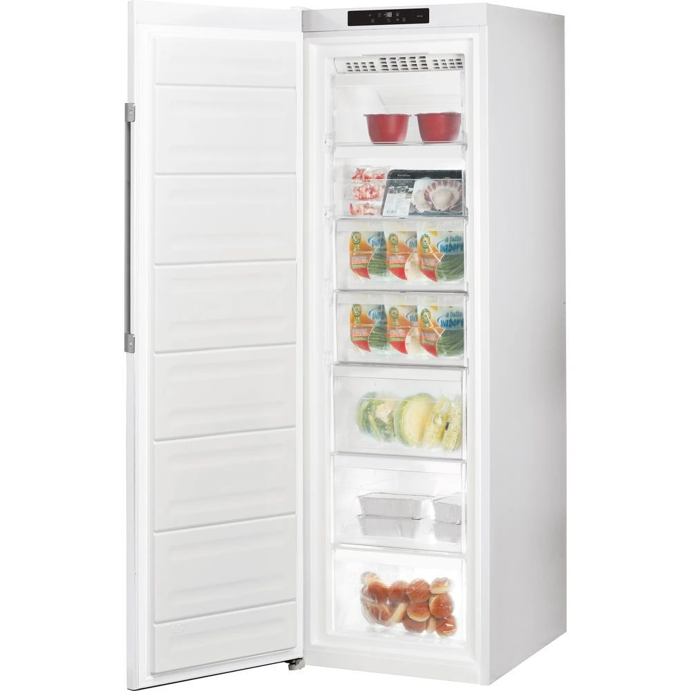 The Hotpoint UH8F1CWUK1 comes in a Modern white finish with an external handle. At 187.5cm High X 60cm Wide, it offers an impressive 260 litres of space which is more than enough room to hold a Family Size weekly shop with ease. One great benefit is that you’ll never need to defrost this freezer, or lose space to ice build up. This is because it’s fully frost free. It also means food will keep colour and texture when frozen, and it’s far easier to keep food like sausages separate. So you’ll make a saving on your energy bills if replacing an older model. There are compartments inside, so you’ll have plenty of space to organise your food. They range in different sizes, with the deeper draws able to hold larger items like a frozen chicken, and a smaller pull out tray (perfect for your ice cubes or frozen lollipops). All drawer fronts are see-through too, helping you to spot your food quickly without having to leave the door open for long.