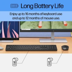 Whether you’re using a desktop computer at the office or computing from the kitchen table, break free from the wired life with the HP 230 Wireless Mouse and Keyboard Combo. Thanks to its full-sized, low-profile chiclet membrane keyboard with numeric keypad and durable mouse, you’ll enjoy greater comfort and productivity without the distracting noise of clicks and keystrokes. Say goodbye to cord clutter and enjoy the freedom of untethered movement with 2.4GHz wireless connectivity using a single USB-A Bluetooth receiver, plus, easily adjust the mouse pointer speed and precision sensitivity up to 1600 DPI for greater control and accuracy for such tasks as photo editing or navigation. Beyond its sleek, comfortable design and wireless connectivity, the wireless keyboard also features 12 dedicated keyboard shortcuts that let you instantly activate popular functions for even greater efficiency. And thanks to its energy-efficient design, the HP 230 Wireless Mouse and Keyboard Combo lets you stay productive all-day, every day without interruption with up to 16 months of keyboard use and up to 12 months of mouse use using a single set of batteries . Click, scroll, and navigate cord-free knowing your wireless keyboard and mouse combo is backed by HP’s 2-year limited warranty. Wireless connectivity up to 32.8ft (10m). Actual battery life will vary with use and environmental conditions and will naturally decrease with time and usage. HP includes a two-year limited warranty with online support available 24×7. Consult the HP Customer Support Center for details, or go to www.hp.com/go/orderdocuments. Internet access required and not included. Actual product may vary from image shown.