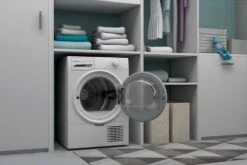 At 8kg capacity you can easily tackle 3 to 4 people’s laundry in one go with the Indesit I2 D81W UK, so there shouldn’t be any queues in the kitchen. It’s a condenser model so moisture is collected in a water tank that’s easy to empty, or you can choose to drain out the water from the Drain hose at the back straight to a close by waste pipe. The easy to set timed drying control lets you choose how long to dry for along with High or Low heat setting to suit sturdy cottons or more delicate fabrics.