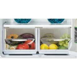 This Indesit Fridge Freezer features: silver colour. Glass shelves with profile fronts, providing robustness and extra safety. Convenient bottle balcony to safely store your bottles. Protecting your food from drying out, Optimal Humidity technology constantly monitors and tweaks the humidity levels inside your fridge. Effectively preventing frost formation inside your appliance, Low Frost uses a wrap-around evaporator in the walls of the unit and glass shelves to keep your unit free from ice. Thanks to Silent Cooling, you appliance will run at a maximum noise level of 38dB(A) so will never interrupt dinnertime, conversation or sleep.