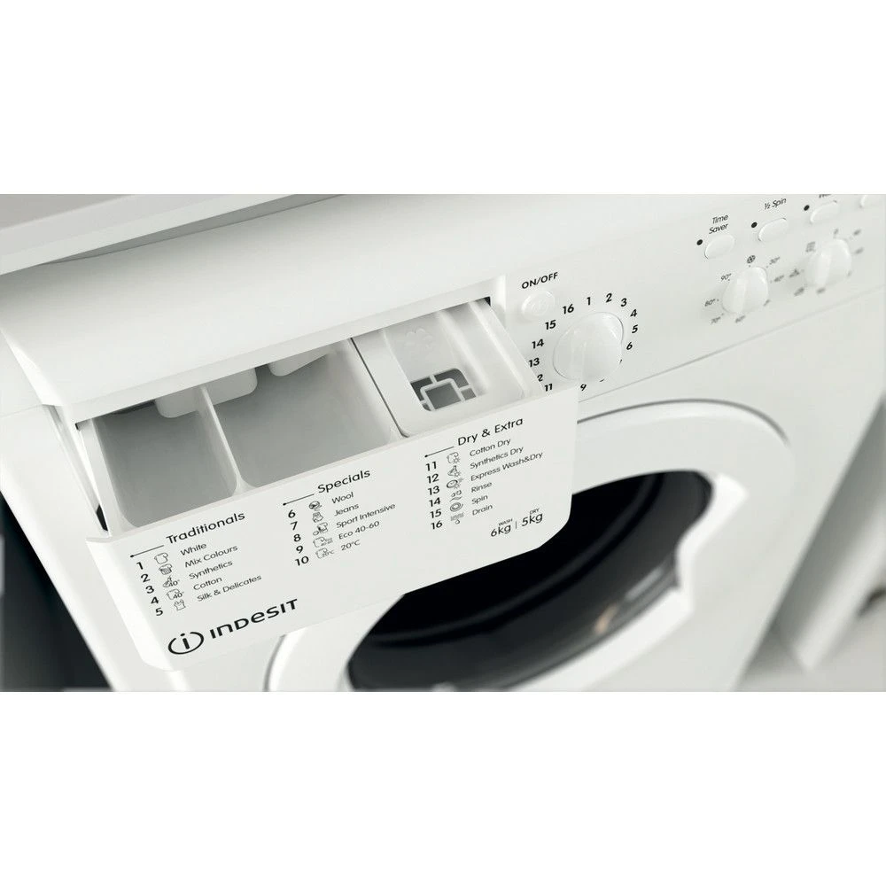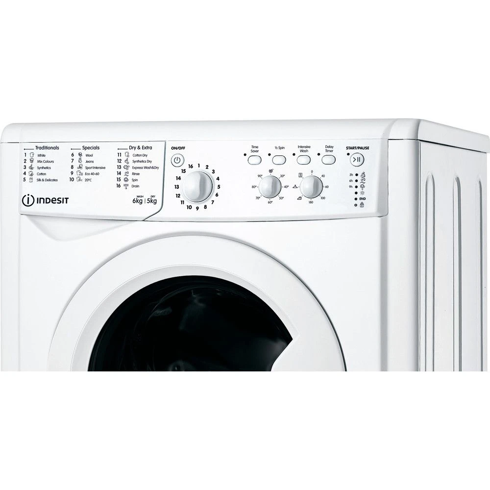 Take care of your laundry loads using the 16 carefully developed programmes of the Indesit Ecotime IWDC 65125 6 kg Washer Dryer. Wash up to 6 kg of clothes in a single load, and make use of the specialised programmes including a wash for silk items. Get the kids PE kits sparkling clean with the Special Sport cycle. Stinky trainers? The Special Shoes cycle will have them looking and smelling fresh in just 60 minutes. Select one of three levels of drying with the Indesit Ecotime IWDC 65125. Iron dry leaves your clothes damp enough to iron easily, whilst Hanger dry means your clothes are ready to be hung up. And if you want put on your favourite jumper straight away, the Cupboard dry setting leaves your clothes perfectly dry. Want the cycle to start while you’re at work? Use the delay timer and delay the start time by up to 9 hours.