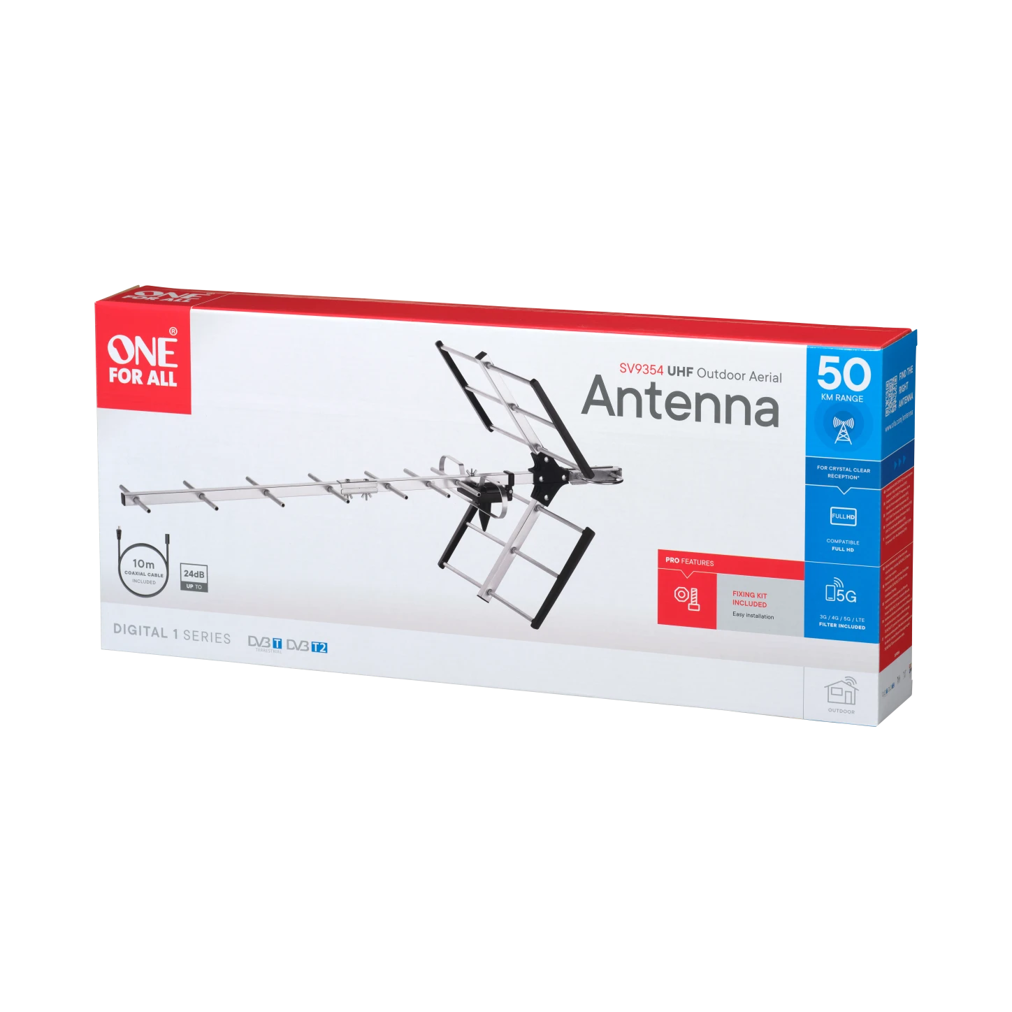 Easy to install Outdoor antenna, capable of receiving all your favorite TV channels in Full HD (DVB-T/T2). For best performance we recommend to use this antenna within a range of 50 km from your nearest transmitter. Designed to withstand the most heavy weather conditions, this performance antenna is suitable to be used outdoors. It’s all weather proof up to IP55 level, 100% water proof. This antenna has a unique 3G/4G/5G block-filter to block all 3G, 4G and 5G mobile phone signals