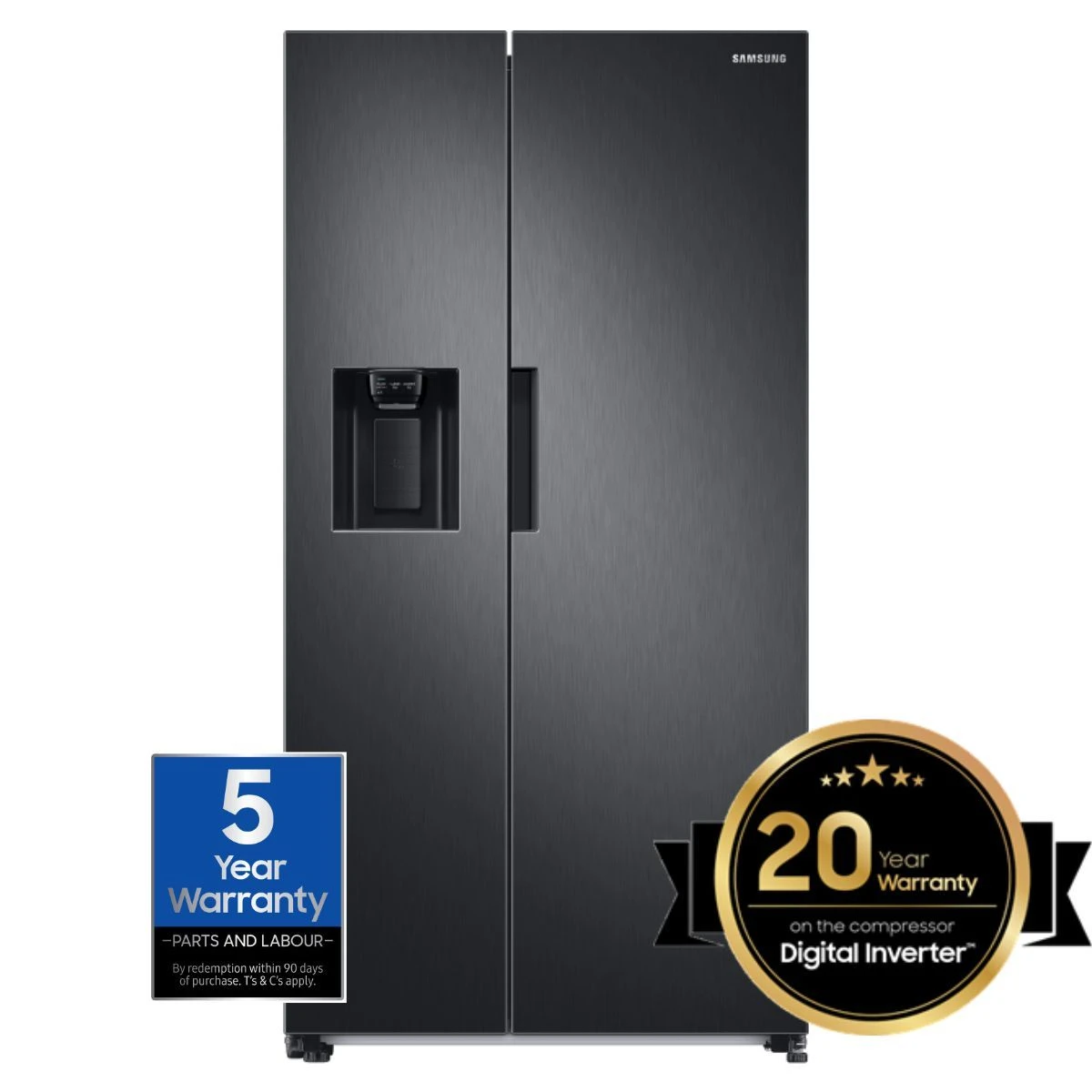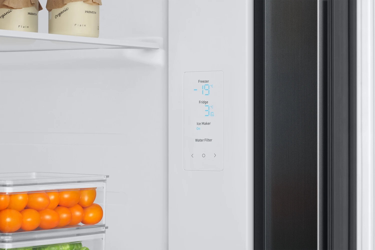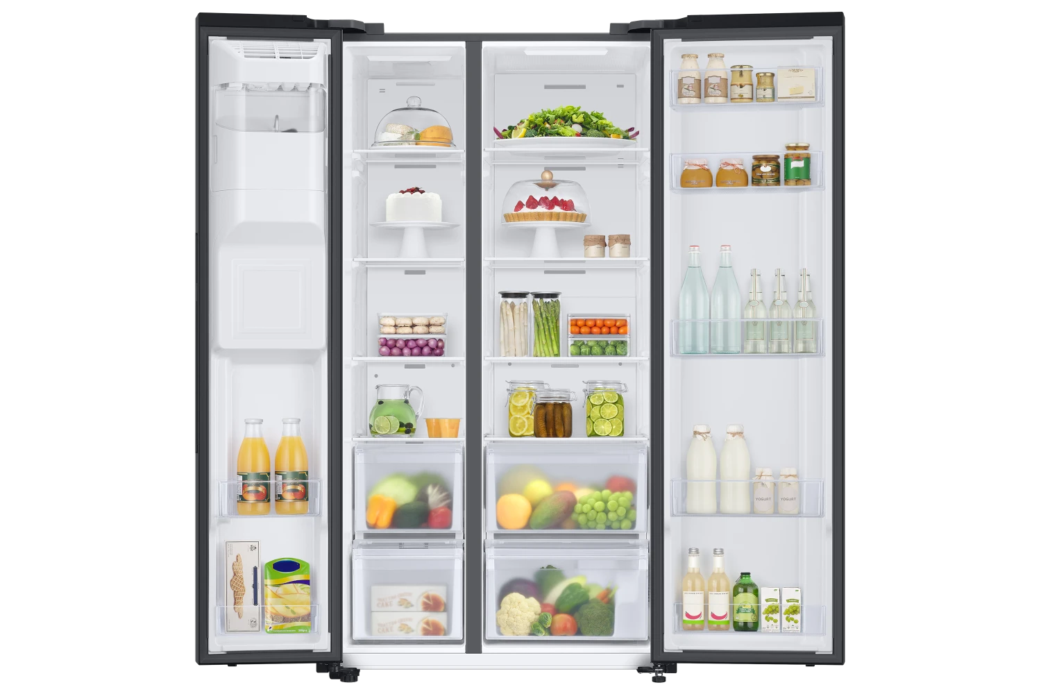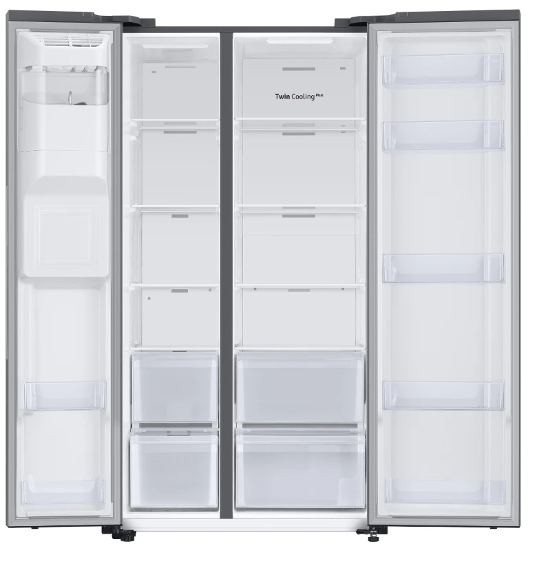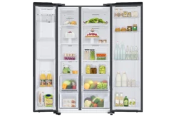 Samsung’s RS67A8810B1 American style fridge freezer is not only a glamorous and stylish addition to any kitchen, it has loads of space for all your freezing and cooling needs, as well as being able to provide ice and water at your convenience. When you’re short on space, but still need to cater for big events, there’s SpaceMaxâ˘. It works by making the walls slimmer, so the same size fridge on the outside has a larger capacity inside. All without compromising on performance. Wouldn’t it be good if all your food in the fridge stayed fresher for longer? With two separate air flows and precise temperature control, Samsung Twin Cooling Plus⢠does just that. So no more dried out vegetables or rubbery cheese. Enjoy a rapid cooling performance. At the touch of a button, Power Cool blows intensely cold air into the fridge to quickly cool your groceries or favorite drinks. Power Freeze delivers a fast blast of cold air into the freezer.